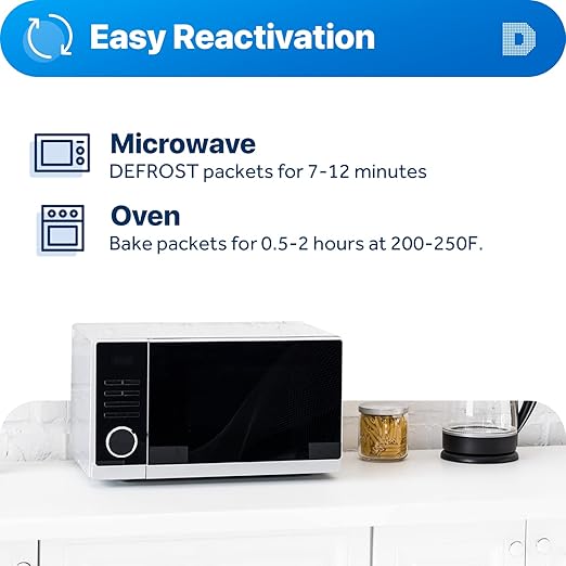 - [Ultimate Moisture Absorption and Reactivation] Packet Material is Special Fabric by Spunbond Technology; For reactivation, place packets in the Oven for 0.5 to 2 hours at 200 to 250F or Microwave for About 7 to 12 Minutes at Defrost Mode;