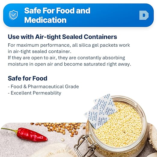 - [How To Use] Place your items and silica gel packets in a tightly sealed container to protect your items from moisture damage; Use silica gel packs to protect Foods, Medications, Vitamins, Seeds, Nuts, Snacks, Cookies, Spices, Pet Foods, 3D Filaments, Guns, Ammos, Canister, Collectables, Jewelry, Documents, Camera Lens, Clothes, Cosmetics, Books, Bags, Decorations, Wet phones, Cameras, Watches, Electronics, Shoes, and Many Other Valuables