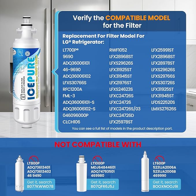 - Compatible Models- Cartridge ADQ36006101-S, ADQ36006101S, ADQ36006102-S, ADQ36006102S, OEM LT700PC, LT700PCS, KENMORECLEAR / SEARS Premium 46-9690, OnePurify RFC1200A RFC 1200A, ICEPURE RWF1200A, Water drop WD-LT700P, Pure Line PL-500 PL500, PUREPLUS PP-RWF1200A, GOLDEN ICEPURE, WATER SENTINEL WSL-3, HDX FML-3, Tier1 RWF1052, Refresh R-9690, Denali Pure WF-LT700P, K&J KJ700, Aqua Fresh WF700, PureH2o PH21410, Mist CWMF041, Water Filter Tree WLF-01, Neo-Pure NP LT700P, AQF-LT700P.