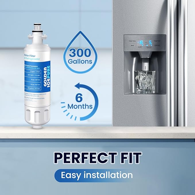- Efficient Filtration Capacity: The GOLDEN ICEPURE refrigerator water filter reduces contaminants in your water, including 99% of chlorine, taste, THM, VOCs, particles, and other major impurities. This significantly improves the taste of drinking water, ensuring it is pure-tasting while retaining beneficial minerals.