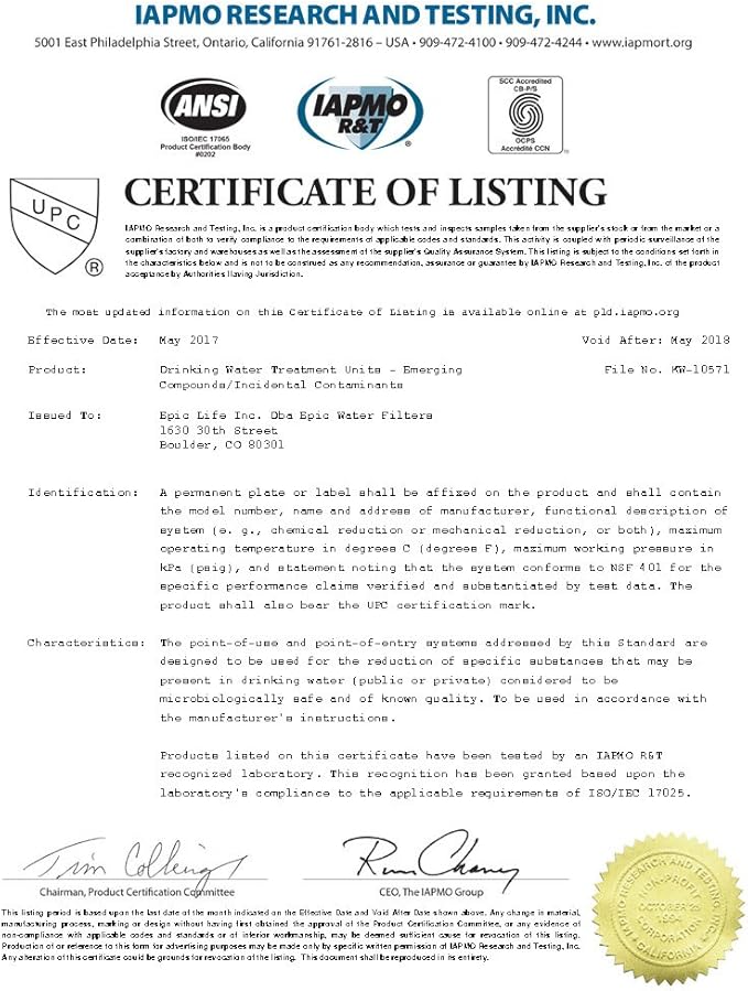 - External Testing Certification : NSF/ANSI 42, 53 & 401