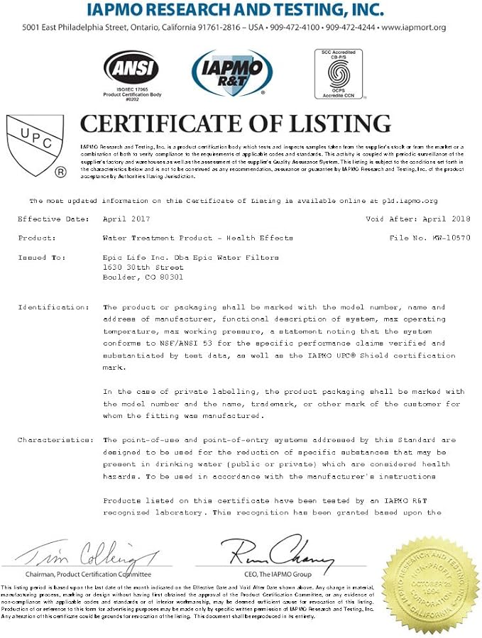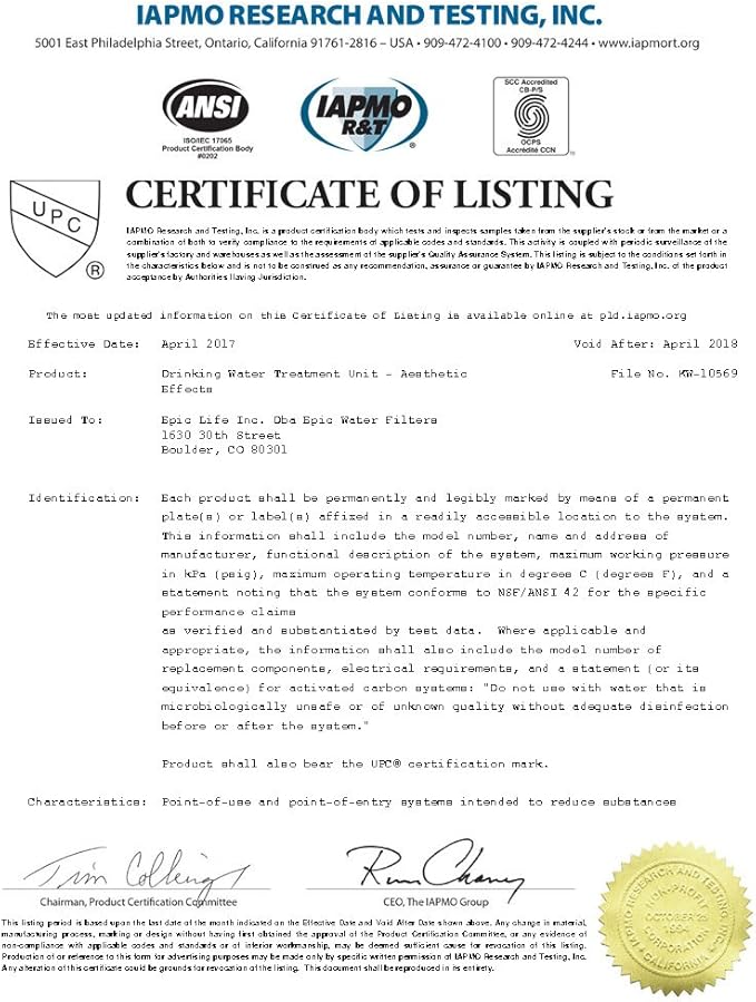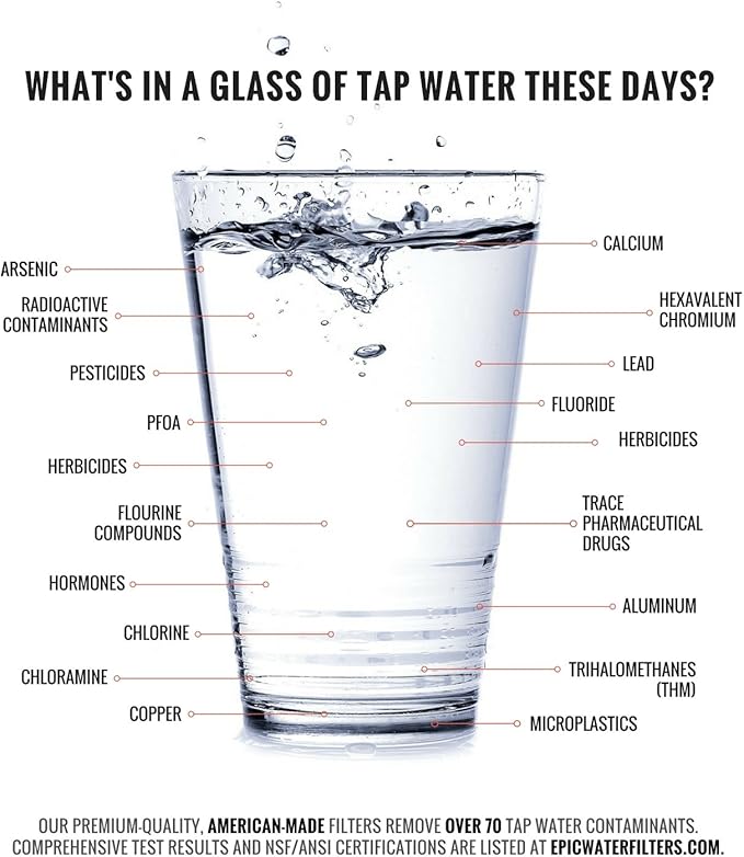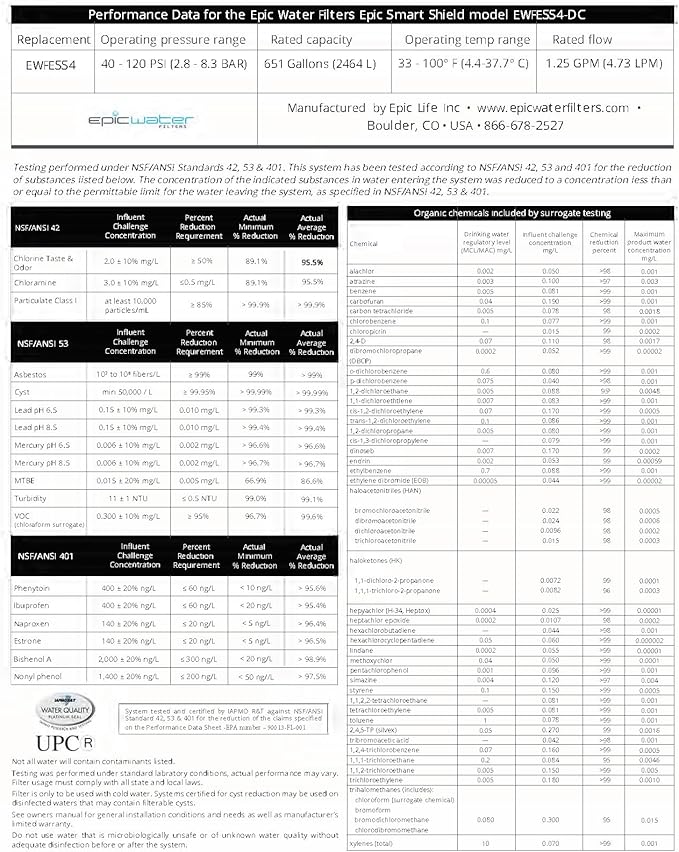 - ✅ INLINE WATER FILTER: The Epic Smart Shield is the perfect inline water filter for house but can also be configured to work as an inline water filter for refrigerator. 3rd Certified against NSF/ANSI 42, 53, and 401. Compare our 3rd party testing to other brands in the category Under Sink Water Filter and you will notice the Smart Shield is the only filter in this group certified to 3 different NSF/ANSI drinking water standards.