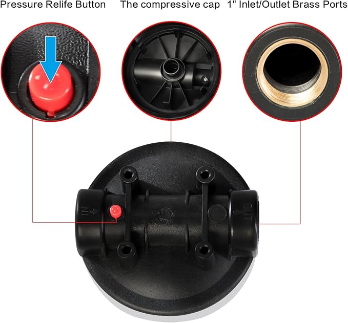 - 10 Inch clear whole house water filter housing,1"NPT inlet/outlet and brass thread,with pressure release button for high flow,plastic wrench and metal bracket.Housing only, filter cartridges are sold separately