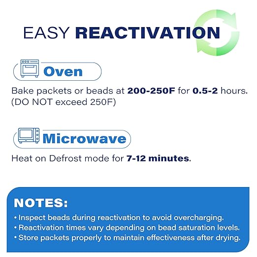 - 【REUSABLE】Set temperature of oven to 150-200℉. Place desiccant packets on an oven safe dish or baking sheet and allow to heat up (recharge) for 1 hour or less depending on saturation level and size of bag. They are recommended to be reused for no more than 3 times