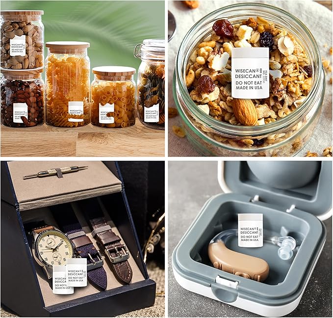 - 【Versatile Applications】: WiseCan Silica gel safeguard storage spaces of up to 360 cu in with just 3g of product. It's ideal for various enclosed storage settings: medicine bottles, pill bottles, reagent bottles, safes, ammo cans, ammo boxes, toolboxes, sealed plastic storage boxes for 3D printer filament, weapon cases, closets. Prevents moisture damage in items: medications, vitamins, food, firearms, important documents, collectibles, books, jewelry, photo albums, shoes, and camera lenses.