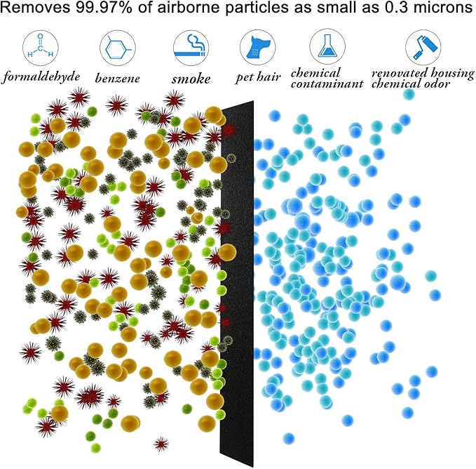 - High Quality Material: The carbon pre-filter is made of interwoven strong fibers that filter large particles, pet hair, dander, etc., extending the life of the air purifier. In addition, the activated carbon component filters pet odors, cooking odors, and smoke odors. Formaldehyde, benzene and other harmful organic chemicals, etc.
