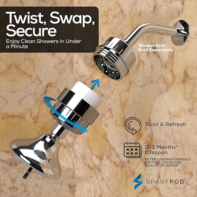SparkPod High Output Shower Filter Cartridge- Suitable for People with Sensitive and Dry Skin and Scalp, Filters Chlorine and Impurities | 1-min install (Standard, 3 pc)