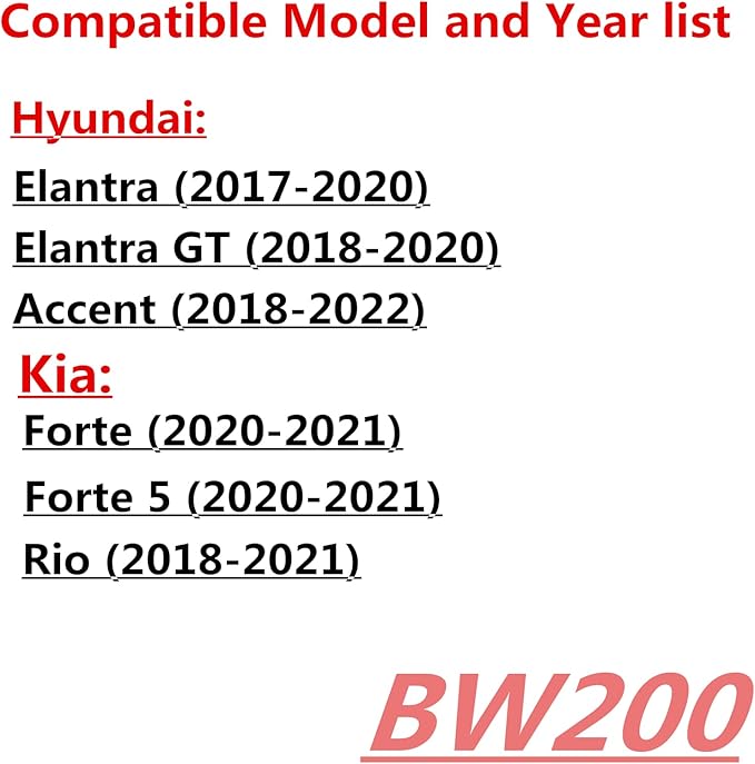 - Compatible with Elantra 2017-2020, Accent 2018-2022,Elantra GT 2018-2020,Forte 2020-2021, Forte 5 (2020-2021),Rio 2018-2021