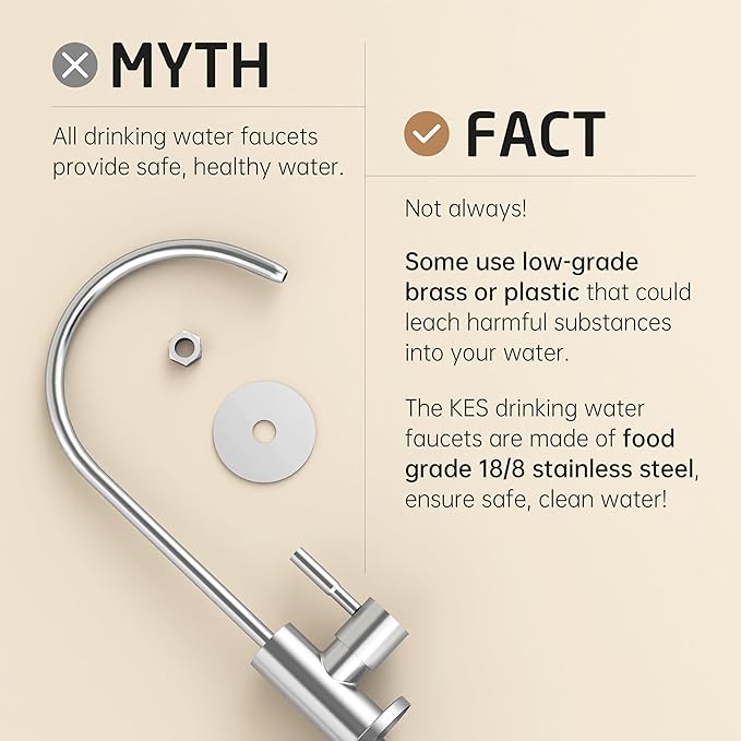 - cUPC NSF Certified: KES reverse osmosis faucet meets U.S. and Canada high-quality standard (Uniform Plumbing Code), certified by IAPMO. The faucet body is made from premium grade no-lead stainless steel (with less than 0.25% lead content), complied with NSF/AB1953 lead-free regulation, and is safe for drinking water. It is more resistant to high heat and pressure, and more sturdy and hardwearing than zinc alloy faucets so it can last many years without leaking.