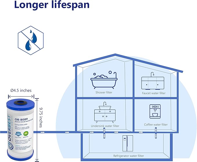 - Product Benefits : Overbest whole house water filter adopts food-grade polypropylene to reduce large particles and sediments larger than 5 microns in diameter effectively. Our premium material and design are committed to providing you with tasty and healthy filtered water. Overbest whole house water filter adopts food-grade polypropylene to reduce large particles and sediments larger than 5 microns in diameter effectively. Our premiu… See more