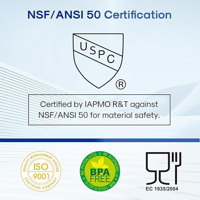 - ππ‘π² πππππππβ Pursuing excellent quality. This filter bears major Authoritative Certifications on markets, such as NSF / ANSI 50 for Material Safely from IAPMO, European Food Grade Regulation EC-1935/2016, ROHS, REACH, BPA-Free,TUV, and Australian Water Mark.
