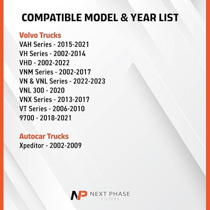 - Pack of 1 Cabin Air Filter Replacement Compatible with - 2015-2021 Volvo Trucks VAH Series, 2002-2014 VH Series, 2002-2022 VHD, 2002-2017 VNM Series, 2022-2023 VN & VNL Series, 2020 VNL 300, 2013-2017 VNX Series, 2006-2010 VT Series, 2018-2021 9700, 2002-2009 Autocar Trucks Xpeditor. Our cabin filters are designed to fit perfectly in your vehicle. Next Phase NP49084 replaces O.E. 20435801; Baldwin PA4681; Donaldson P606555; Fram PA10187; Luberfiner CAF24000; & Wix 49084.