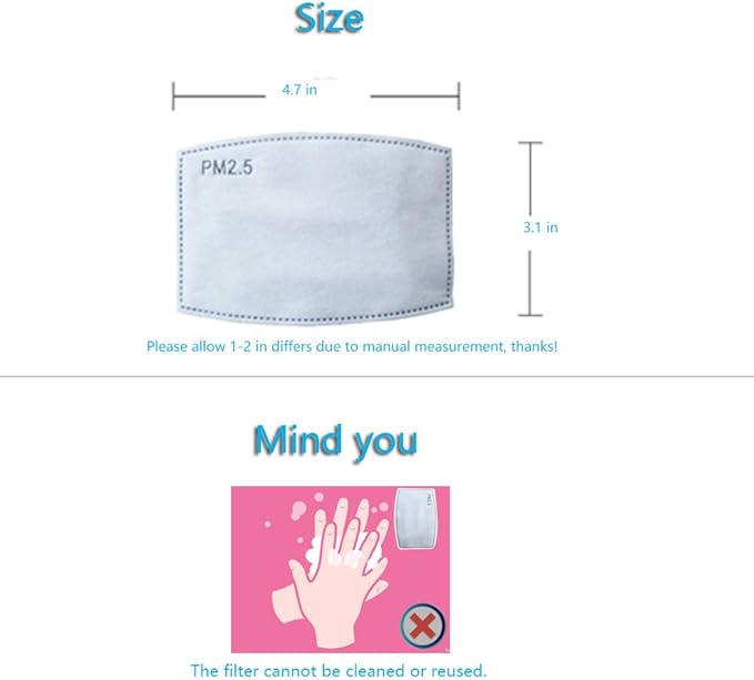 - Size of Adults Mask Filter: 4.7''x3.1''. Suit for adults mouth mask insided with fliter slot.