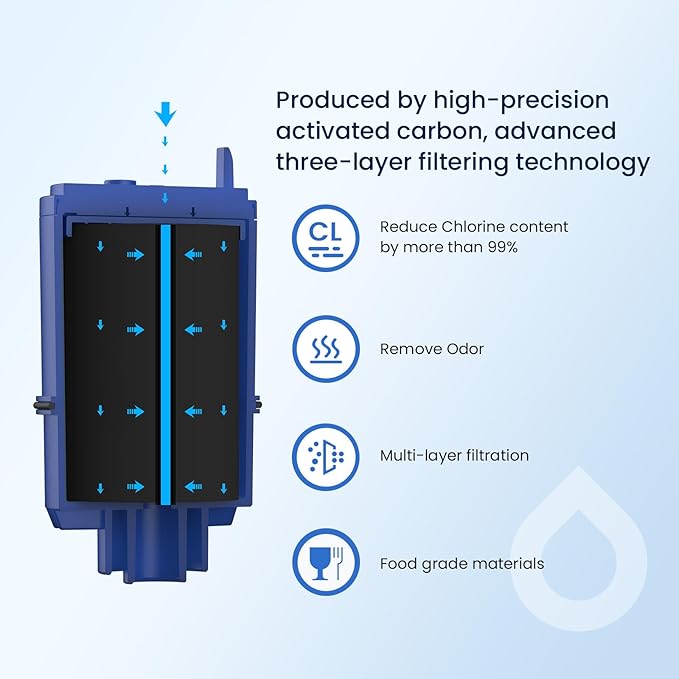 - High-efficiency filtration: GLACIER FRESH for pur water filter replacement utilizes 100% selected coconut shell carbon block from Sri Lanka to filter, more effectively remove suspended particles, heavy metals, residual chlorine and unpleasant odors. After testing, GLACIER FRESH of pur filter replacement faucet has a filtration accuracy of 0.5 microns, which can effectively remove 97.9% of the residual chlorine and maintain a good taste of the water.