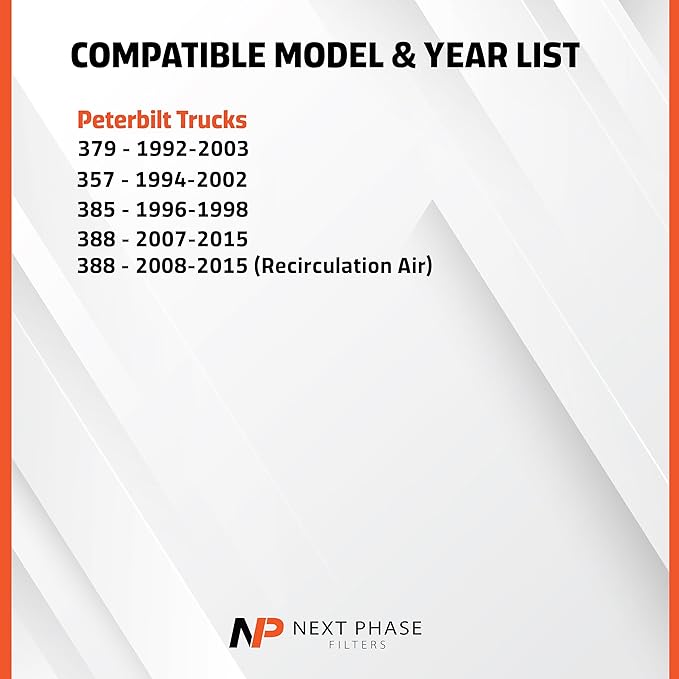 - Pack of 1 Cabin Filter Suitable for Peterbilt Trucks - Next Phase Filters NP24116 Cabin Filter is compatible with various Peterbilt Trucks - these include the 1992-2000 Peterbilt Trucks 379, 1996-1998 385, and 2008-2015 388. For cross reference, refer to Baldwin PA5321, Donaldson P614224, Luberfiner CAF24006, Wix 24116. Fits O.E. 5X000180, 5X000190