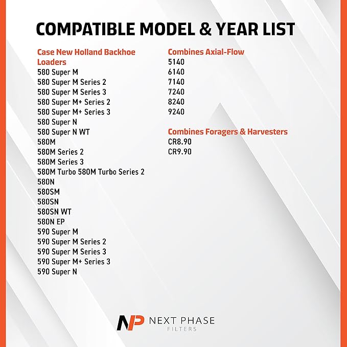- Pack of 1 Cabin Filter Suitable for Backhoe Loaders, Combines, Foragers & Harvesters - Next Phase Filters NP10005 Cabin filter is compatible for various Case Backhoe Loaders, Case Combines Axial-Flow, New Holland Combines, Foragers and Harvesters. For cross reference, refer to Baldwin PA5668; Wix WP10005. FIts O.E. 360260A2