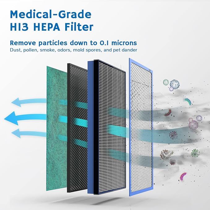 - HEPA FILTRATION: The medical-grade H13 HEPA filter helps you breathe easier by removing 99.97% of fine airborne particles down to 0.1 microns. This includes particles like dust, pollen, smoke, odors, mold spores, and pet dander.