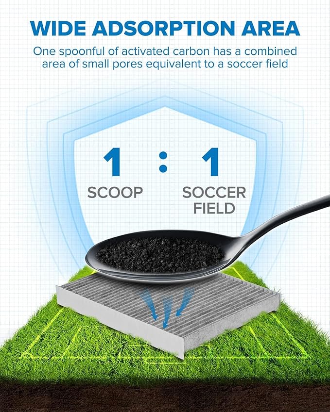 - Enjoy Fresh Air: Activated carbon cabin air filter quickly adsorbs unpleasant odors from outside the ventilation system, provides a more comfortable interior environment for the driver and passengers without adding chemical odor neutralizer