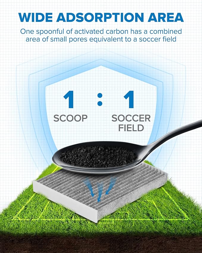 - Enjoy Fresh Air: Activated carbon cabin air filter quickly adsorbs unpleasant odors from outside the ventilation system, provides a more comfortable interior environment for the driver and passengers without adding chemical odor neutralizer