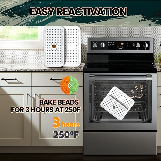 - 【Transparent Window & Easy Reactivation】: With the transparent window, you can easily monitor the color of the silica gel. If it turns from orange to light green, it indicates that the environmental relative humidity is above 50%. To reactivate the reusable silica gel canister desiccant dehumidifier, simply place it in the oven for 0.5 to 3 hours at 200°F to 250°F (avoid exceeding 250°F). The actual reactivation time may be shorter depending on the condition of the silica gel beads.