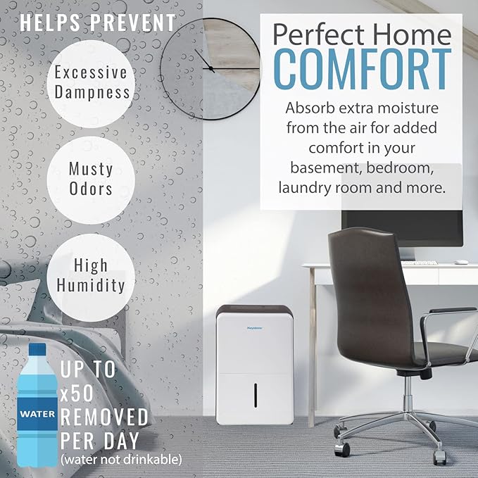 - Reliable 50 Pint Dehumidifier for Home: Keystone's efficient dehumidifier removes up to 50 pints of moisture from the air per day improving quality, reducing humidity, odor and damp areas