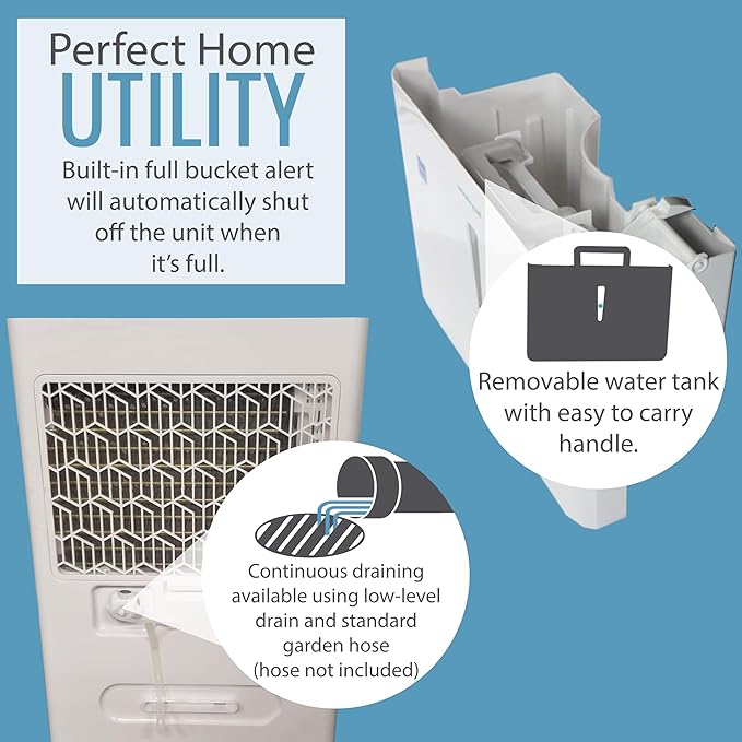 - Reliable 50-Pint Dehumidifier: Keystone's efficient dehumidifier removes up to 50 pints of moisture from the air per day improving quality, reducing humidity, odor and damp areas; Great for multiple rooms on the same floor, garages, basements, and more
