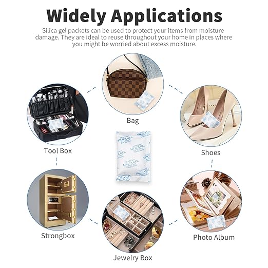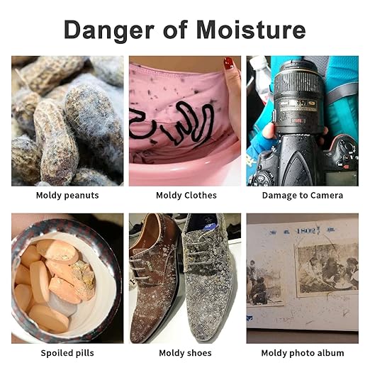 - 【WIDELY APPLICATION】– Our moisture absorbers are widely used in your daily life, such as Spices, 3D Filaments, Safes, Ammos, Canister, Jewelry, Documents, Camera Lens, Clothes, Cosmetics, Books, Bags, Decorations, Wet phones, Cameras, Watches, Electronics, Shoes, and Many Other Valuables.