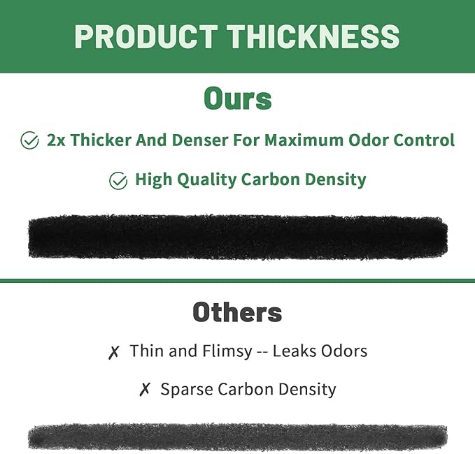 - SAFE MATERIAL:These activated carbon filters (fibrous) are made of high-quality powdered activated carbon as the adsorption material, and the high-density polymer binding material is used to attach the carbon to the fiber. With the thickness of 0.5cm (0.2"), the filters can efficiently absorb odors.