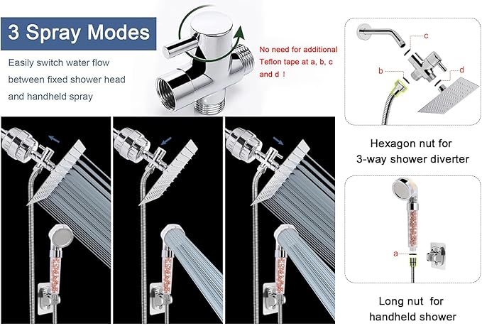 - Skin Care Shower Head Combo: Made from high quality stainless steel and food grade ABS production. HarJue filter shower head combo provides maximum water filtration to make skin softer and hair shinier.