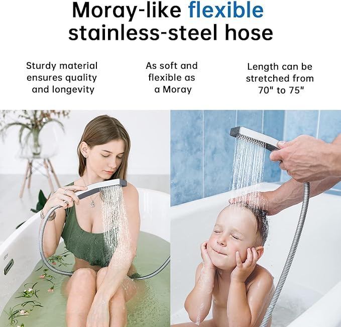 - ALL METAL HANDHELD SHOWERHEAD AND LONG HOSE: The hose can be stretched from 70" to 75". it's easy for you to shower yourself, bath your babies, your pets or cleaning the toilet. A good quality hose refuses winding