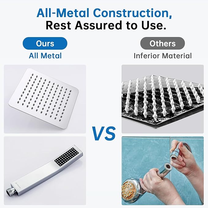 - SHOWER HEAD COMBO: 10" rainfall shower head with handheld wand. Both are metal construction that not easy to break. The top shower brings a powerful water flow to you. The handheld sprayer makes you feel a convenient shower experience