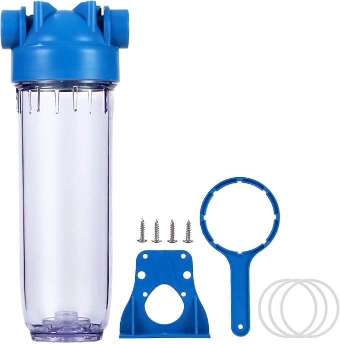 - 10 Inch whole house clear water filter housing,3/4 inch brass ports with pressure relief button for high pressure,with plastic wrench and bracket.clear housing allows you to see when you need to change filters and everything else works as it should