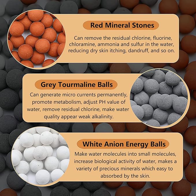 - ✅Upgraded 5-Stage Filtration - Our hydro shower head filter includes a double layer pp cotton fiber, anion mineral stones (white), tourmaline (grey) and medical stone (red), which can effectively remove 99.9999% of harmful substances (pollution, rust, heavy metals and organic chemicals, etc.). Ensuring the safest shower water in hard water environments