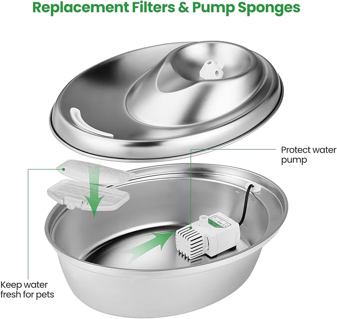 - đșăCompatibilityă12Pack replacement filters & 6 pump sponges set compatible with D60 100oz/3L stainless steel pet water fountain; We provide 12-Month replacement & refund and 24-hour customer service, please contact us at any time.