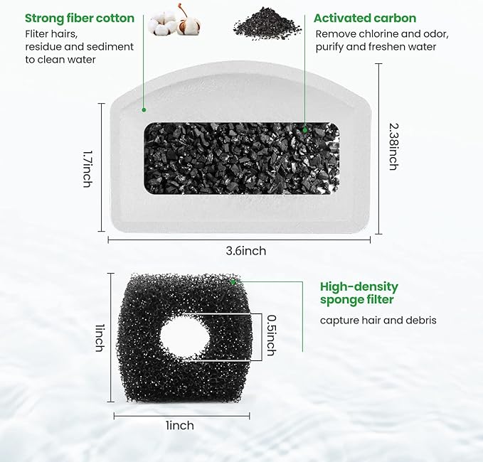 - đă Freshen Water for PetsăCat water fountain filters has 3 layer filtration system, first high density cotton mesh layer fliter hairs and residue, keep water clean; Second activated carbon powder layer remove chlorine and odor, purify and freshen water; Third natural ion-exchange resin, can remove heavy metals ions and improve the taste, keep fresh and healthy water for your pets.