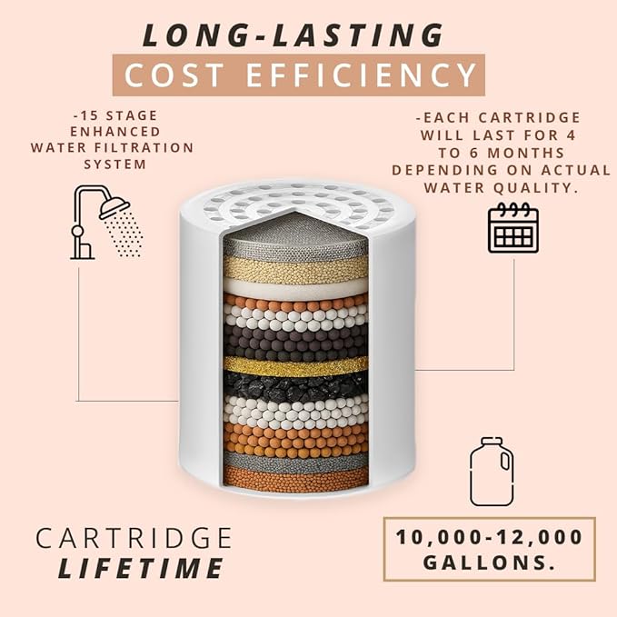 - LONG-LASTING COST EFFICIENCY - Save with our 15-stage showerhead filter that lasts longer and costs only 0.09 cents per day. Reduce maintenance costs while enjoying consistently purified water that enhances skin, hair, and nails