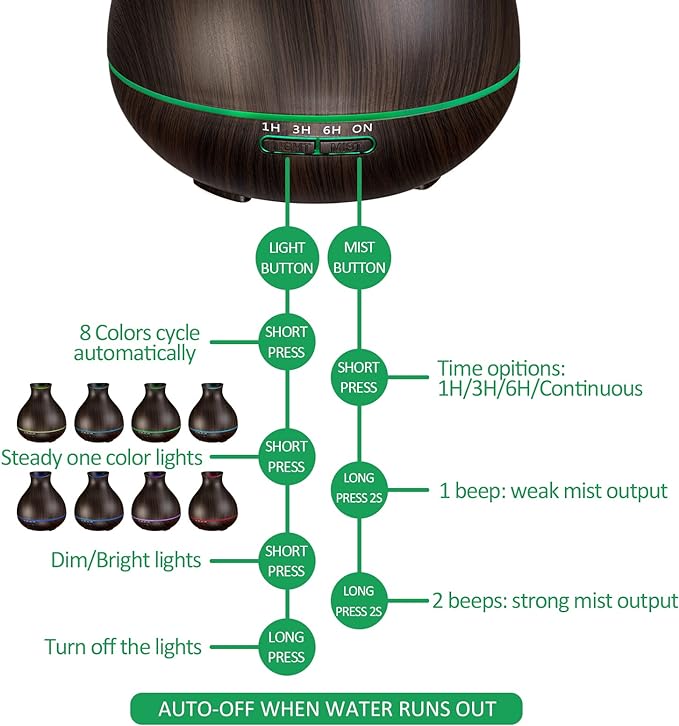 - TIMER SETTING AND MIST CONTROL,WATERLESS AUTO-OFF: You can change the lights to whatever you feel at the moment, constant color or rotation of 7 colors, each light has bright and dim modes. Timer set in 1H/3H/6H/continuous on. When time is up or there is no water, the cool mist humidifier will turn off automatically,no risk of burns.