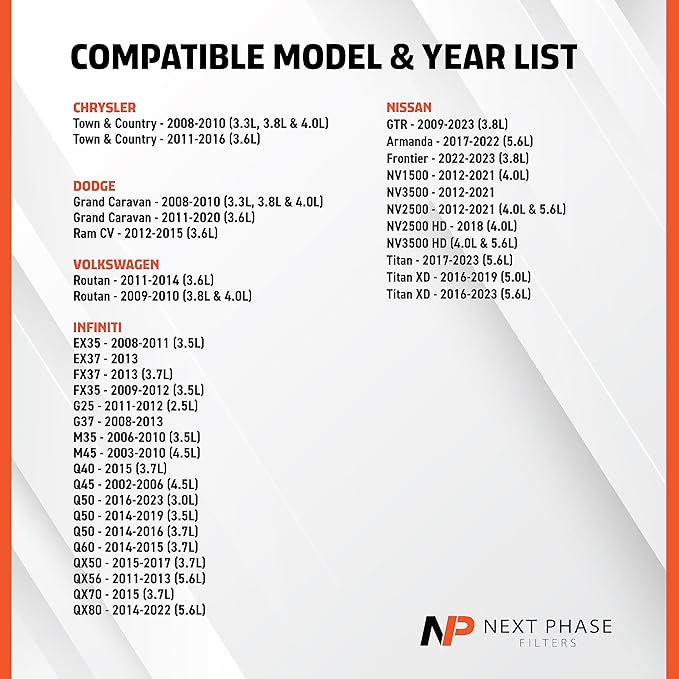 - Compatible with - Various Chrysler Town & Country, Dodge Grand Caravan, Ram CV, Volkswagen Routan, Infiniti EX35/37, FX35/37, G25/37, M35/45, Q40/45/50/60, QX50/56/70/80, Nissan GTR, Armanda, Frontier, NV1500/3500/2500, NV2500 HD/3500 HD, Titan and Titan XD. Fits perfectly in your vehicle. Next Phase NP24479 replaces O.E. 27277EG025, 999A2VX000, 7B0819644, 68127809AA, 27277VX01A, 68042866AA, B7277EG01A, 27277EG000; Wix 24479, Fram CF10743, Purolator C25870, Champ CAF1815P.