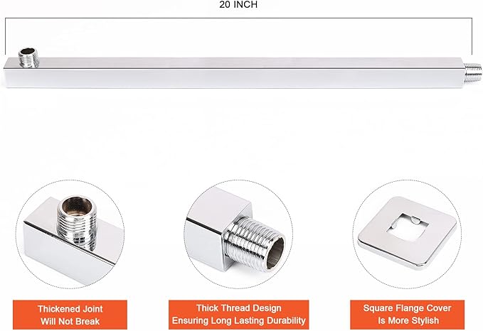 - SQUARE SHOWER ARM: Standard U.S 1/2 NPT Tapered Threads. HarJue 20-inch shower arm providing large wall distance for a relaxing shower. Square shower head with square shower arm is more luxurious