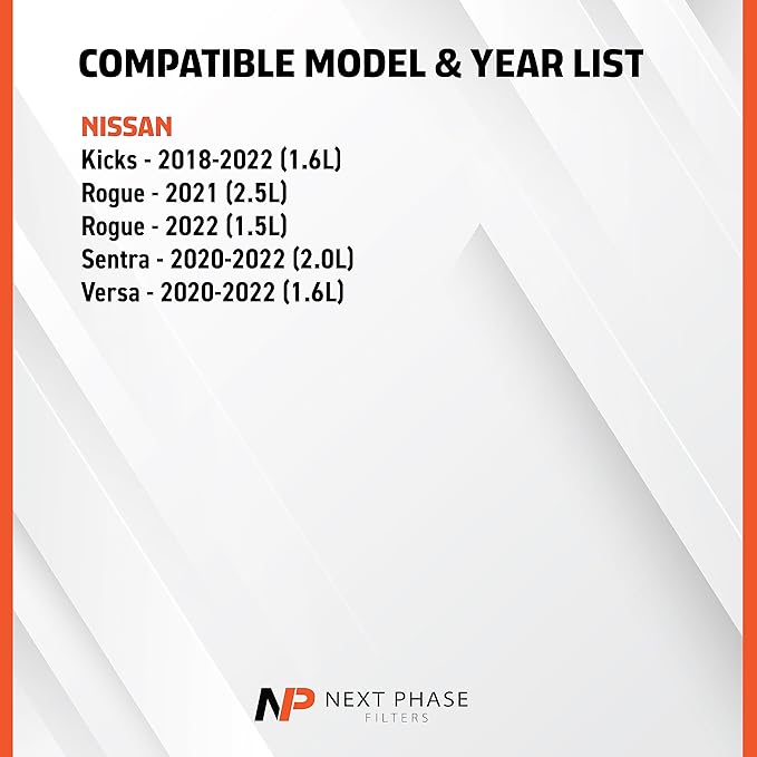 - Pack of 1 Cabin Filter: For Carbon Upgrade, See NP10447. Compatible with - 2018-2022 Nissan Kicks 1.6L, 2021 Rogue 2.5L, 2022 1.5L, 2020-2022 Sentra 2.0L, 2020-2022 Versa 1.6L. Our cabin filters are designed to fit perfectly in your vehicle. Next Phase NP31439 replaces O.E. 278915RB0A, 278915RB0B; Purolator C31439, Champ CAF10050P.