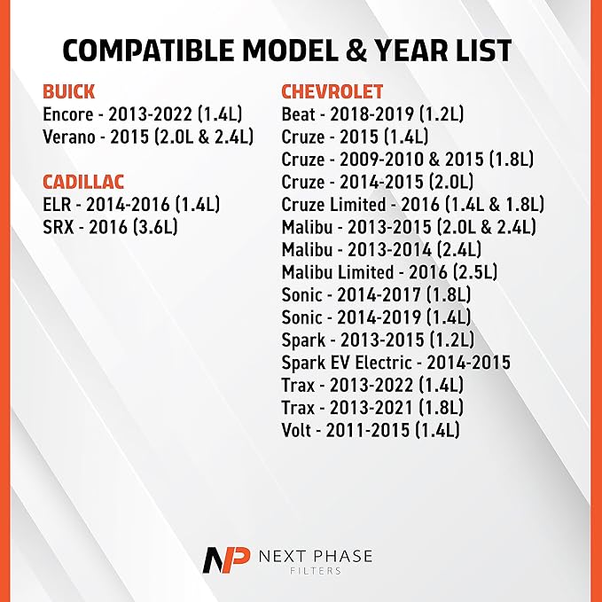 - Pack of 1 Cabin Air Filter Replacement Compatible with - Various Chevrolet Beat, Cruze, Cruze Limited, Malibu Limited, Sonic, Spark, Spark EV Electric, Trax, Volt, 2013-2022 Buick Encore 1.4L, 2015 Verano 2.0L & 2.4L, 2014-2016 Cadillac ELR 1.4L, 2016 SRX 3.6L. Our cabin filters are designed to fit perfectly in your vehicle. Next Phase NP36154 replaces O.E. 13271190, CF181; Wix 24590, Purolator C36154, Fram CF10775, Champ CAF1872P.