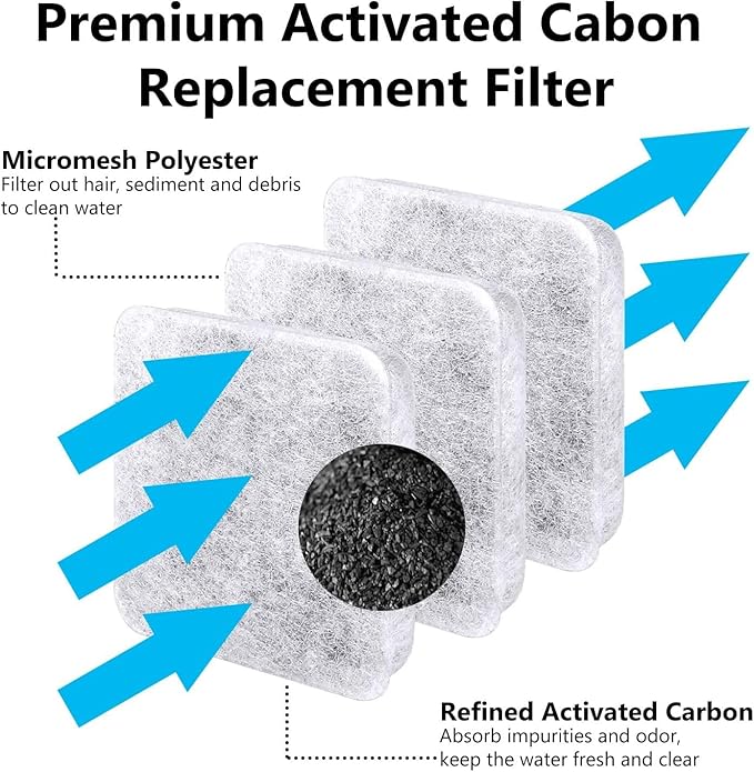 - 【REFINED ACTIVATED CHARCOAL】 Finer charcoal granules on dog water bowl filter increase the surface area exposure to water and maximize the effective filtration. Compatible with Petmate water dispenser make the most effective to remove bad tastes and odors from water and encourage your pet to drink more water, which is good for their overall health