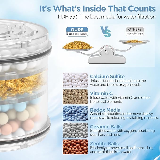 - Shower Head Filter for Hard Water: Do you suffer from dry skin, weak hair, or unpleasant smells coming from your showerhead? Look no further than our revolutionary shower head filter system, featuring a cutting-edge blend of the most patented KDF-55, advanced Calcium Sulfite, Vitamin C, and More. MakeFit water softener shower head effectively removes chlorine, fluoride, heavy metals, and other contaminants from your shower water, providing clean and pure water for your enjoyment