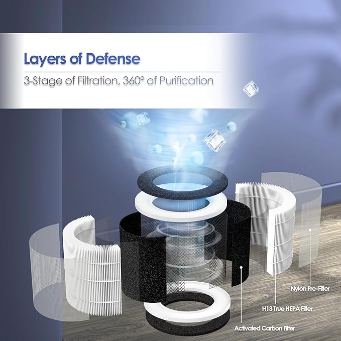 - [ ðŊðēðŽÂ° ðĢðĻðĨðððððð§ððĒðĄ ðĒð ðððĨ ]: VK-6067B filter uses a higher grade H13 High Efficient material, the barrel-type 360° filtration & intercepts the suspended solids in the air, effectively filtering particles and tinyDusts of 0.3Ξm and above, such as dust, hair, pet dander, common air pollutants, etc., the purification rate is more than 99.97%