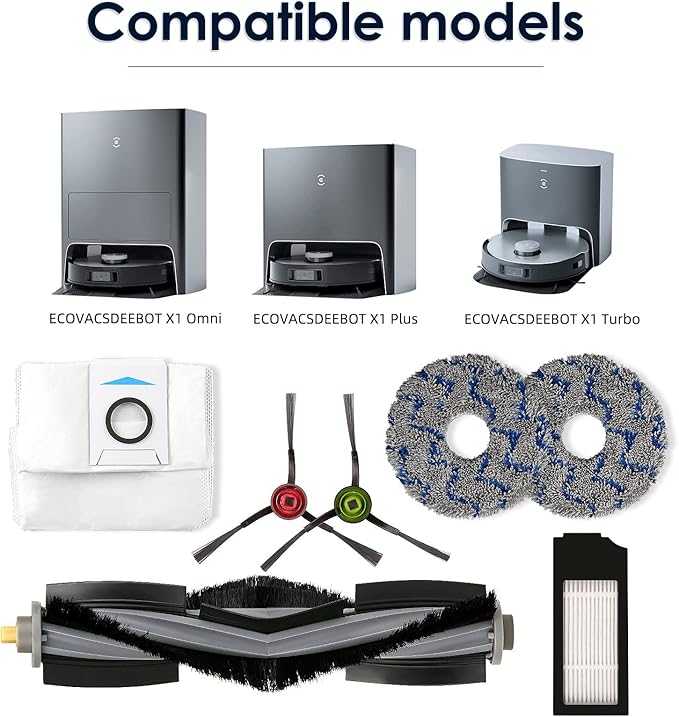 - 【Specially Designed】 The Replacement kit is specially developed for robotic vacuum ECOVACS DEEBOT DEEBOT X1 OMNI/ X1 PRO OMNI/ X1 OMNI/ T10 OMNI. Please make sure your model is correct before order. This package will come with 15 pieces of high quality replacement parts including 1 Roller Brush, 3 HEPA Filters, 3 Dust Bags, 4 Side Brushes, 4 Mop Pads.