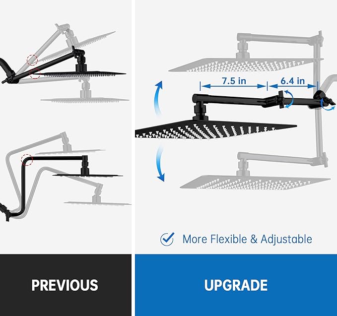 - FLEXIBLE EXTENSION ARM PATENTED DESIGN: The length of 15 inch avoid the trouble of being too close to the wall when showering. Two knobs allows you choose any height and angles you need. Easily tightened