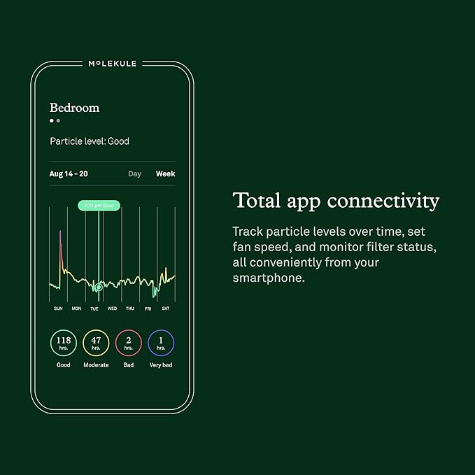 - Seamless Connectivity & Portability: Monitor indoor and outdoor air quality, track air history, and control all your purifiers from the Molekule app anywhere with our portable feature