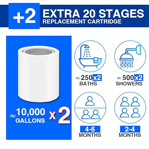 - ✔【Great Value】- Includes a total of 3 pcs 20 stage shower filter cartridges (ONE is already in the filter shell, and the other one is for future replacement) + free shower drain covers; each filter cartridge can last about 6 months or 12,000 gallons of water usage (depends on your local water quality and use frequency).