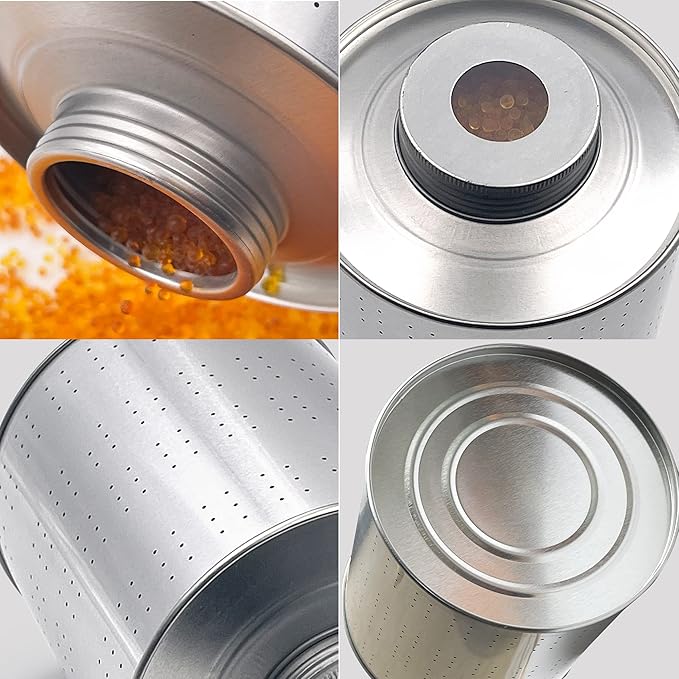 - 【Portable & Durable Silica Gel Desiccant Containers】: 900 grams sturdy metal canister is designed with aluminum perforated mesh sides and filled with regenerable silica gel. The indicating silica gel can is robust, resistant to dents, and prevents rust. The container features a removable lid, and the top cap can be unscrewed to easily empty the contents. Its independent and portable design offers convenience in both usage and storage. Effective volume of 675 cubic feet.