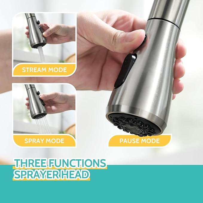 - 【Multifunctional Sprayer Head-Meet Your Needs】23 inches pull down sprayer head and 360 degrees swivel designs make our touchless kitchen faucets effective cover the entire sink. Three water functional ways (spray/stream/ pause) meet your various needs.